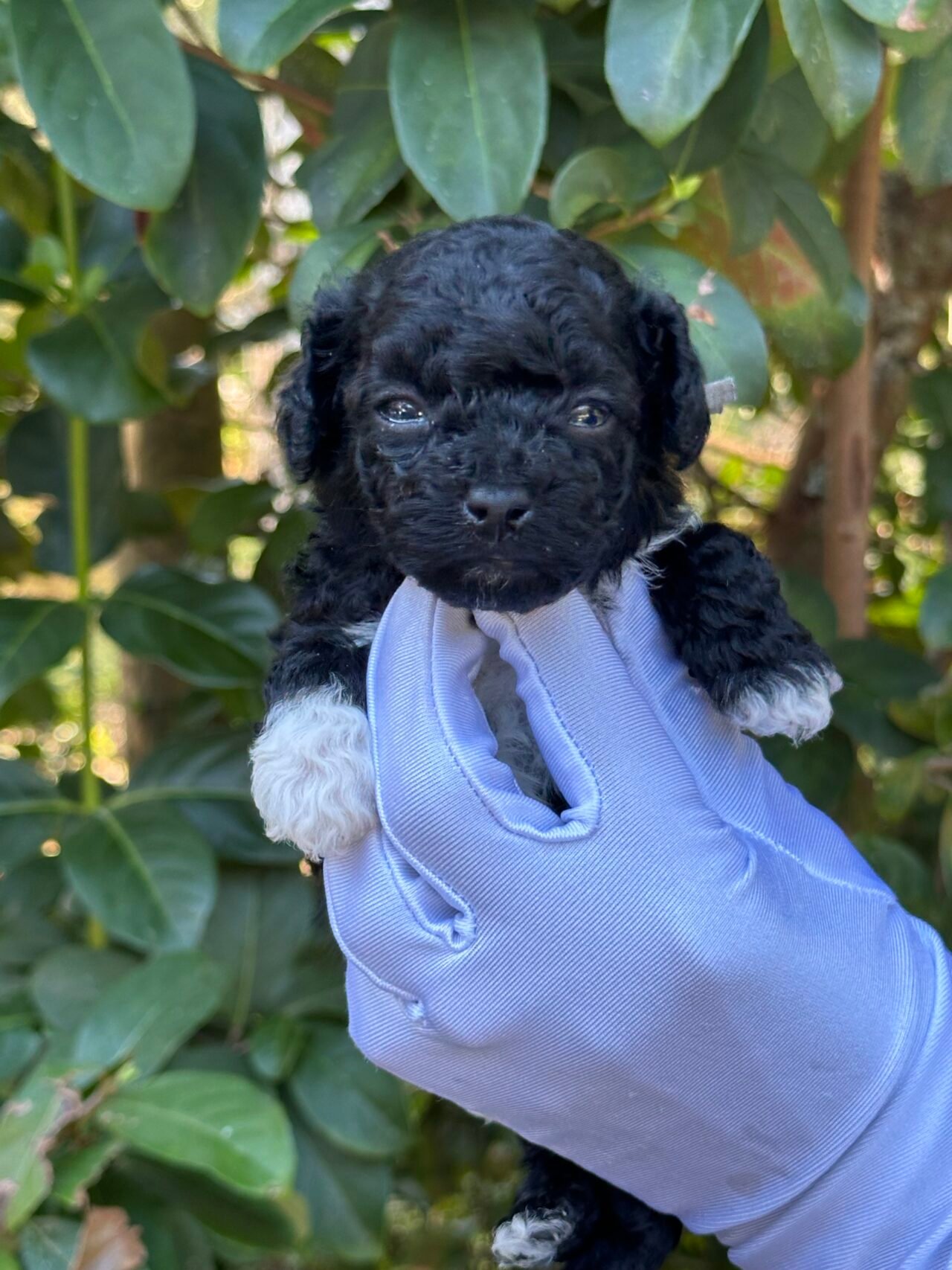 We are excited to announce the arrival of a handsome black male toy poodle with white markings and white paws, born on September 26, 2025. He comes from our beautiful pairing of Cookie and Cash, both of whom are known for their loving personalities, intelligence, and exceptional coats.