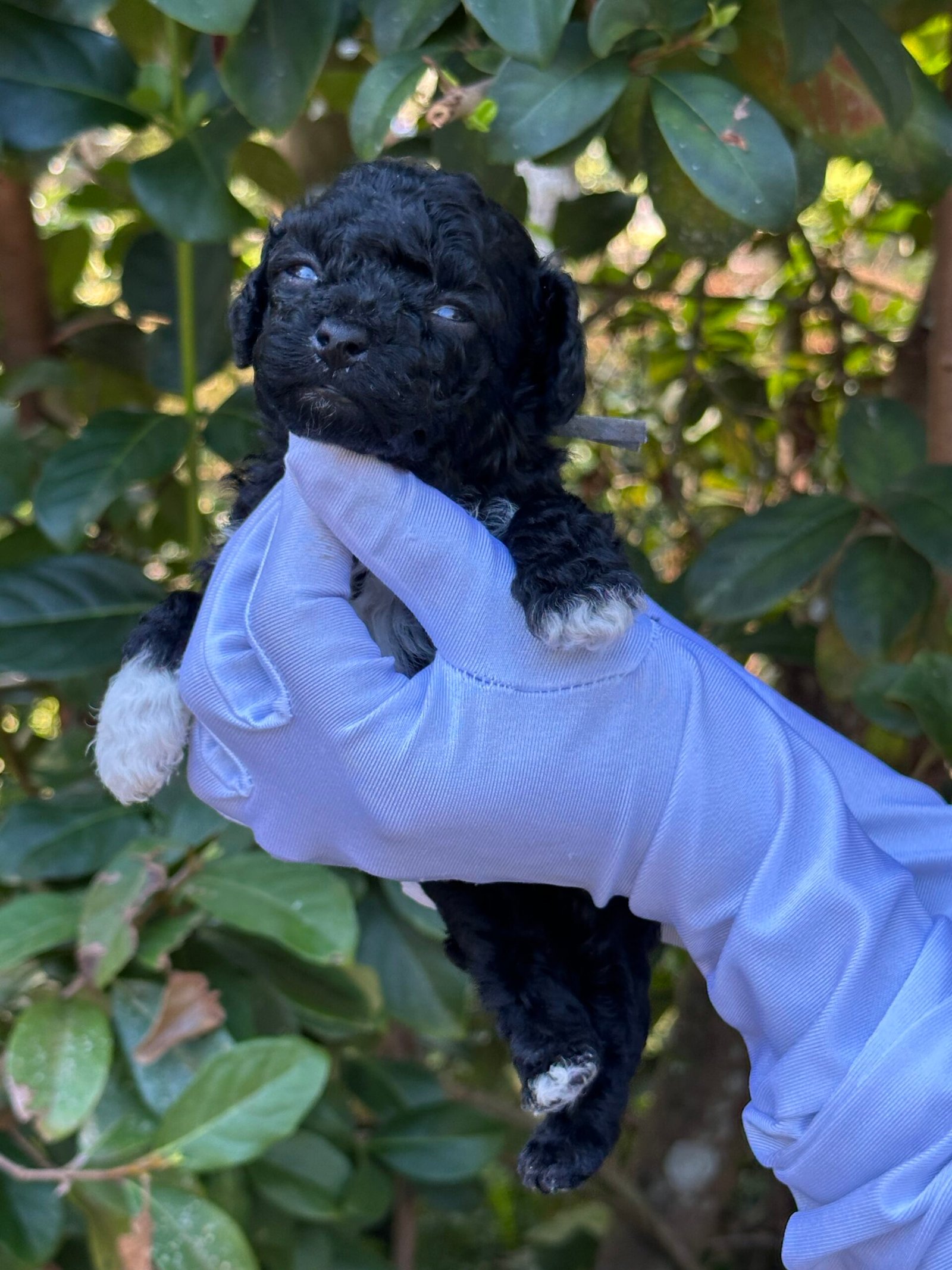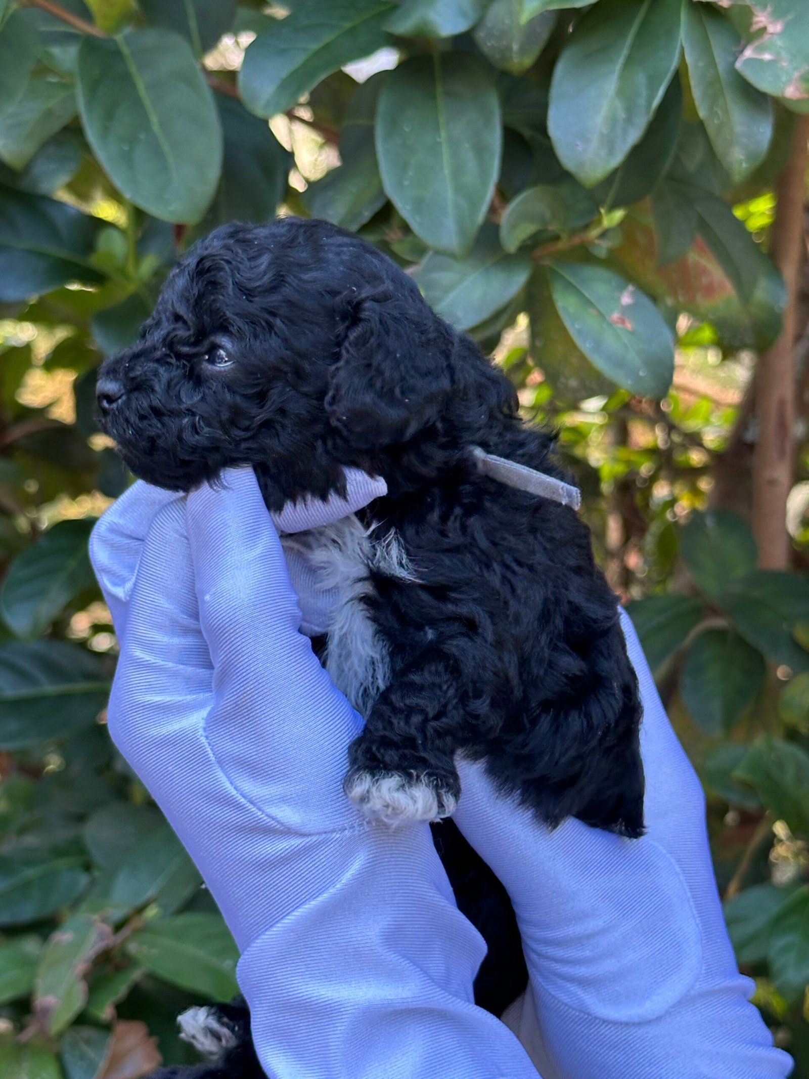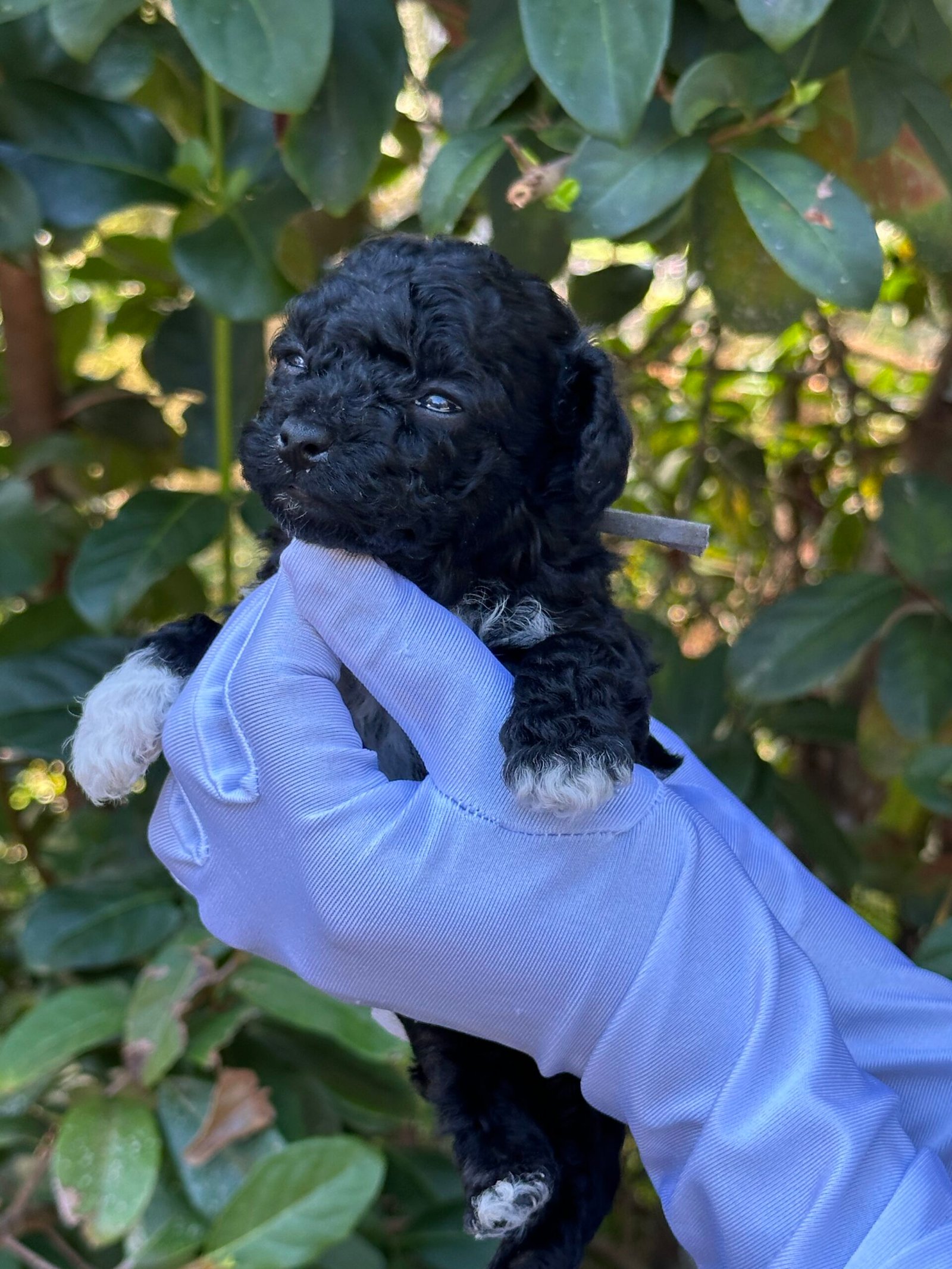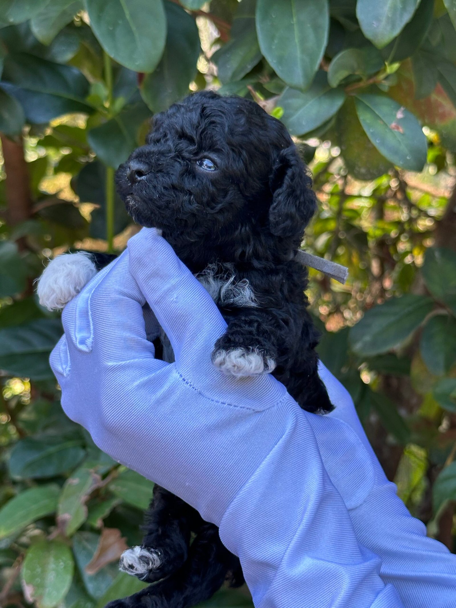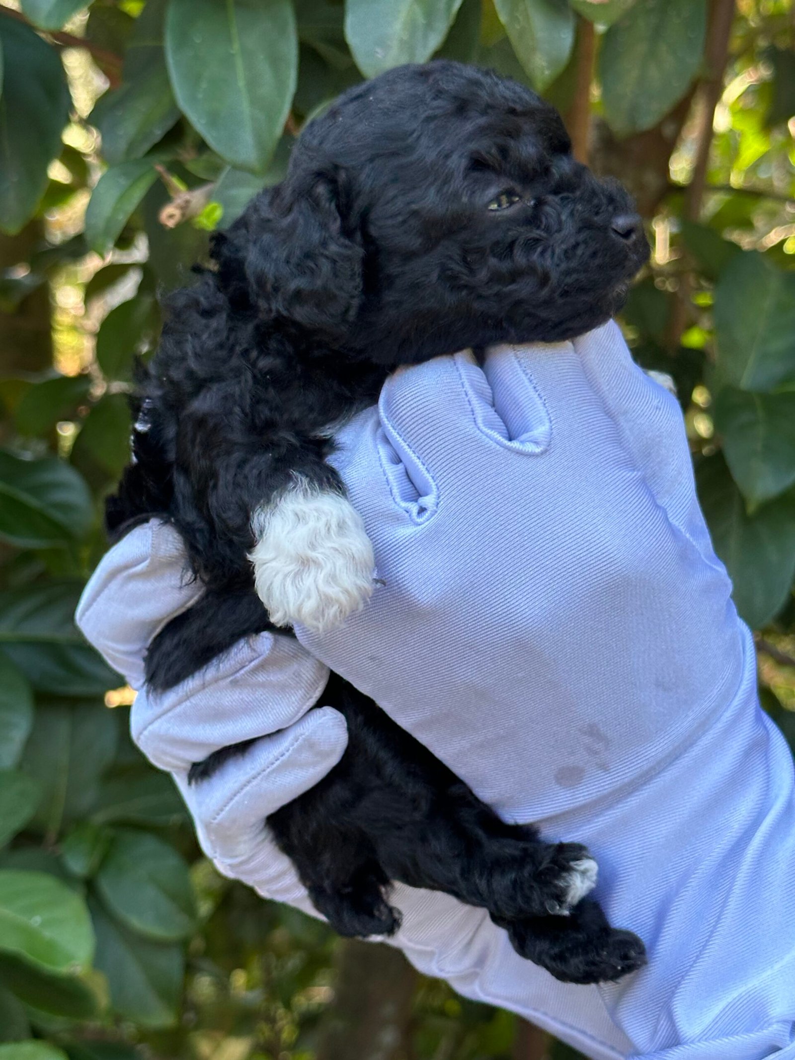 We are excited to announce the arrival of a handsome black male toy poodle with white markings and white paws, born on September 26, 2025. He comes from our beautiful pairing of Cookie and Cash, both of whom are known for their loving personalities, intelligence, and exceptional coats.