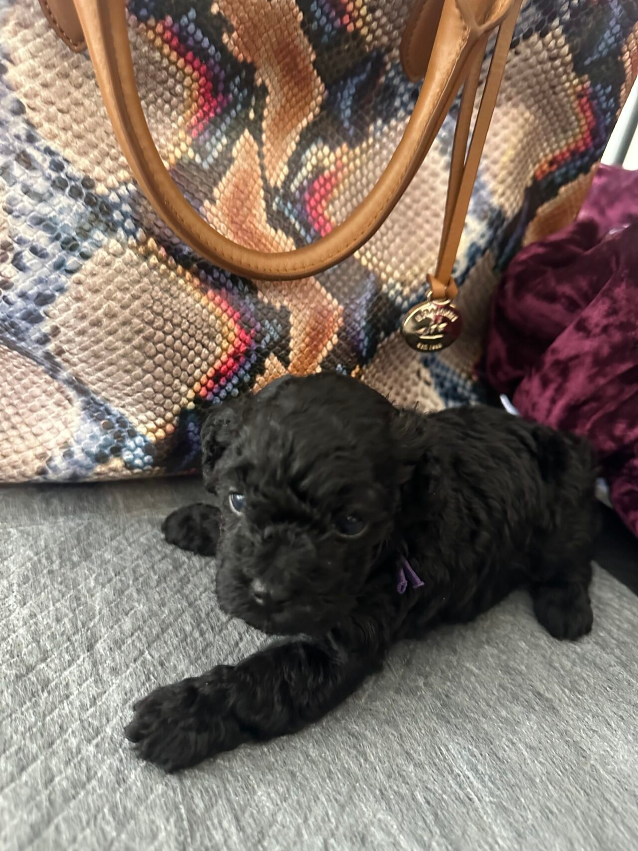 This beautiful girl is part of our September 26, 2025 Cookie and Cash litter, and her stunning jet-black coat makes her truly stand out. Black toy poodles are highly desired for their elegant appearance, intelligence, and loving temperament, so she won’t be available for long.
