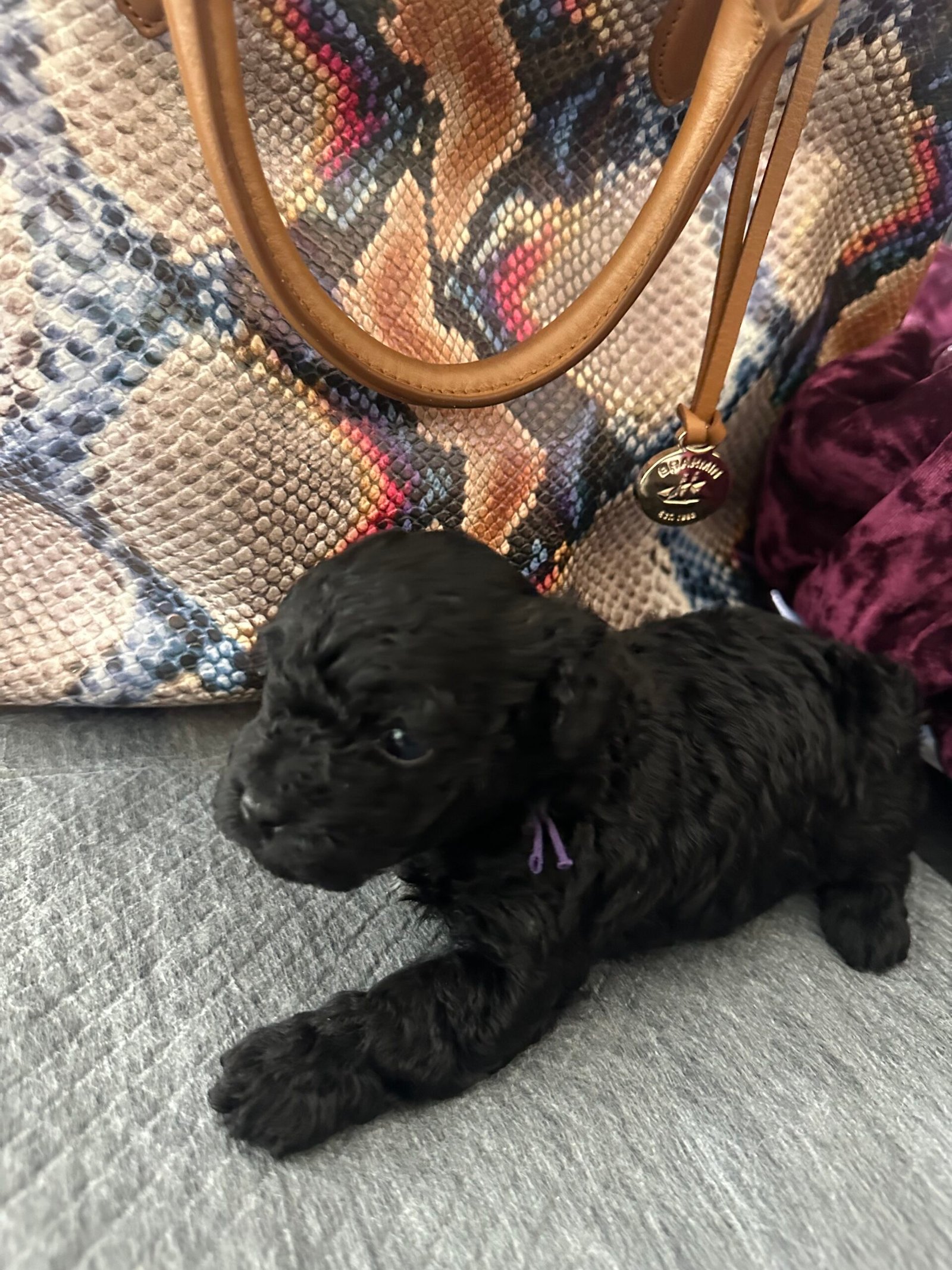 This beautiful girl is part of our September 26, 2025 Cookie and Cash litter, and her stunning jet-black coat makes her truly stand out. Black toy poodles are highly desired for their elegant appearance, intelligence, and loving temperament, so she won’t be available for long.